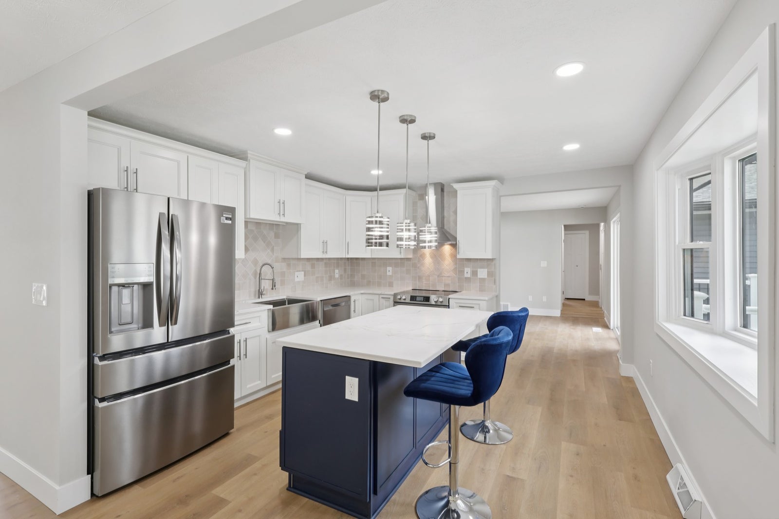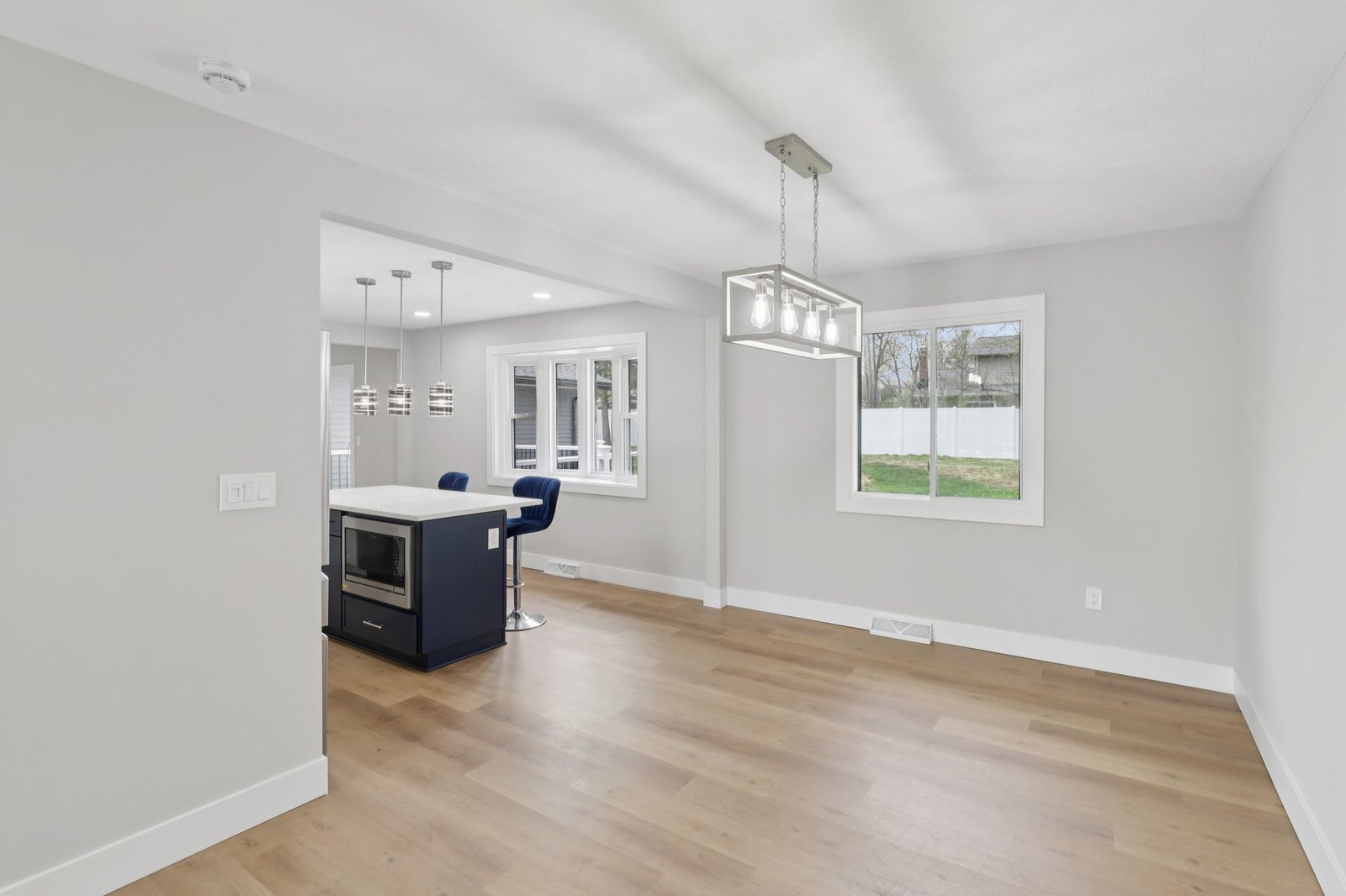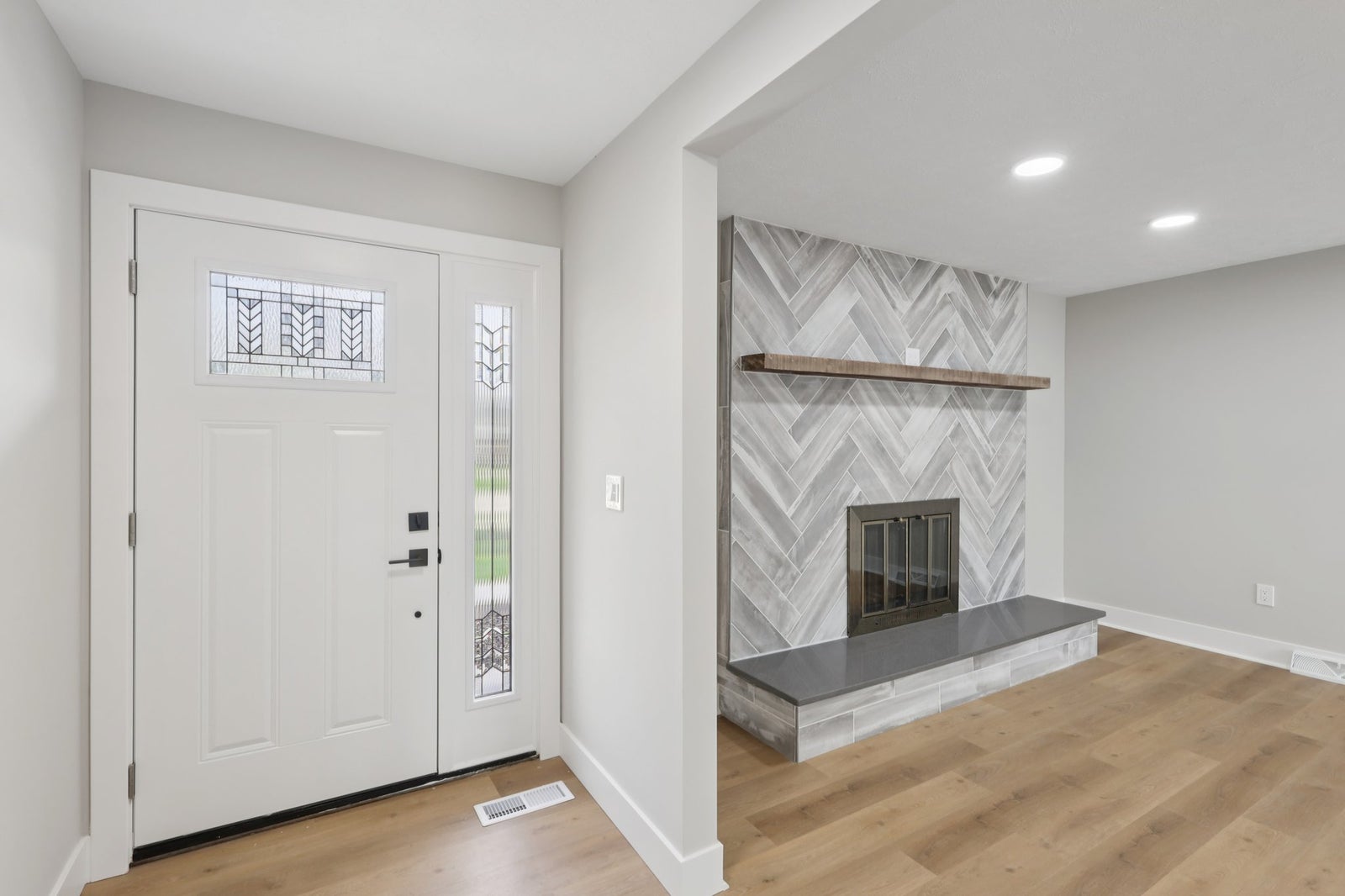 Completely updated and move-in ready! This stunning 3-bedroom, 2 full bath ranch offers the perfect blend of modern style and comfortable living. From the moment you arrive, you’ll appreciate the fresh exterior and inviting curb appeal. Step inside to a bright, open layout featuring all new flooring, fresh paint, updated lighting, and stylish fixtures throughout. The spacious living room is filled with natural light from the large picture window and flows seamlessly into the beautifully redesigned kitchen. The kitchen is a showstopper with white cabinetry, stainless steel appliances, tile backsplash, and a large center island—perfect for entertaining or everyday living. The main level also features a cozy living room with a striking fireplace accent wall and dining room with sliding doors leading to the backyard, creating an ideal indoor-outdoor connection. Three comfortable bedrooms and two fully updated baths complete the main floor. The finished basement expands your living space with a large recreation area and a sleek modern fireplace—perfect for a media room, game space, or additional entertaining area. Every detail has been thoughtfully updated, offering a truly turnkey home you won’t want to miss!